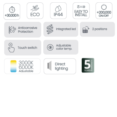 Iluminación LED de bajo consumo. Luz con temperatura de color regulable de 3000K a 6500K. Diseño ECO, sin plomo ni cobre. Protección anticorrosiva. Certificación IP20. Intensidad de la luz regulable. Luz directa. Rotación 360º. Encendido/apagado táctil. Más de 30.000h de uso. Cargador incluido. 3 años de garantía*